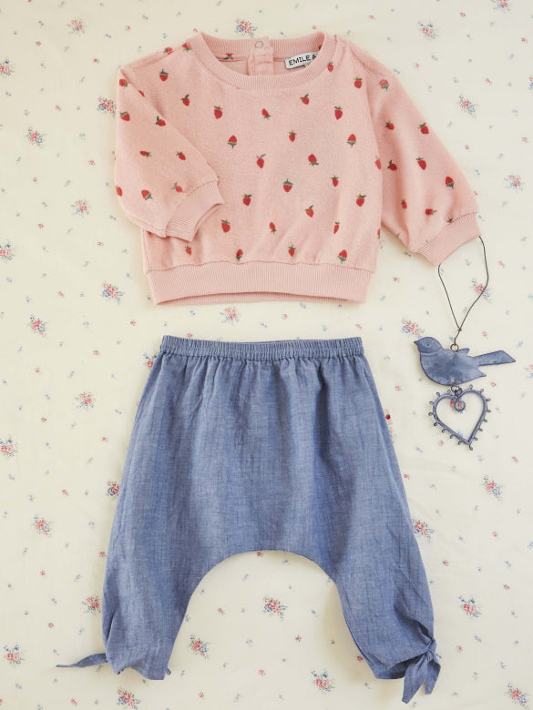 Dit pofbroekje van Emile et Ida is een luchtige en comfortabele keuze voor zowel meisjes als jongens. Het heeft een denim look, maar is gemaakt van soepel katoen, waardoor het heerlijk zacht aanvoelt en perfect is voor de lente en zomer.