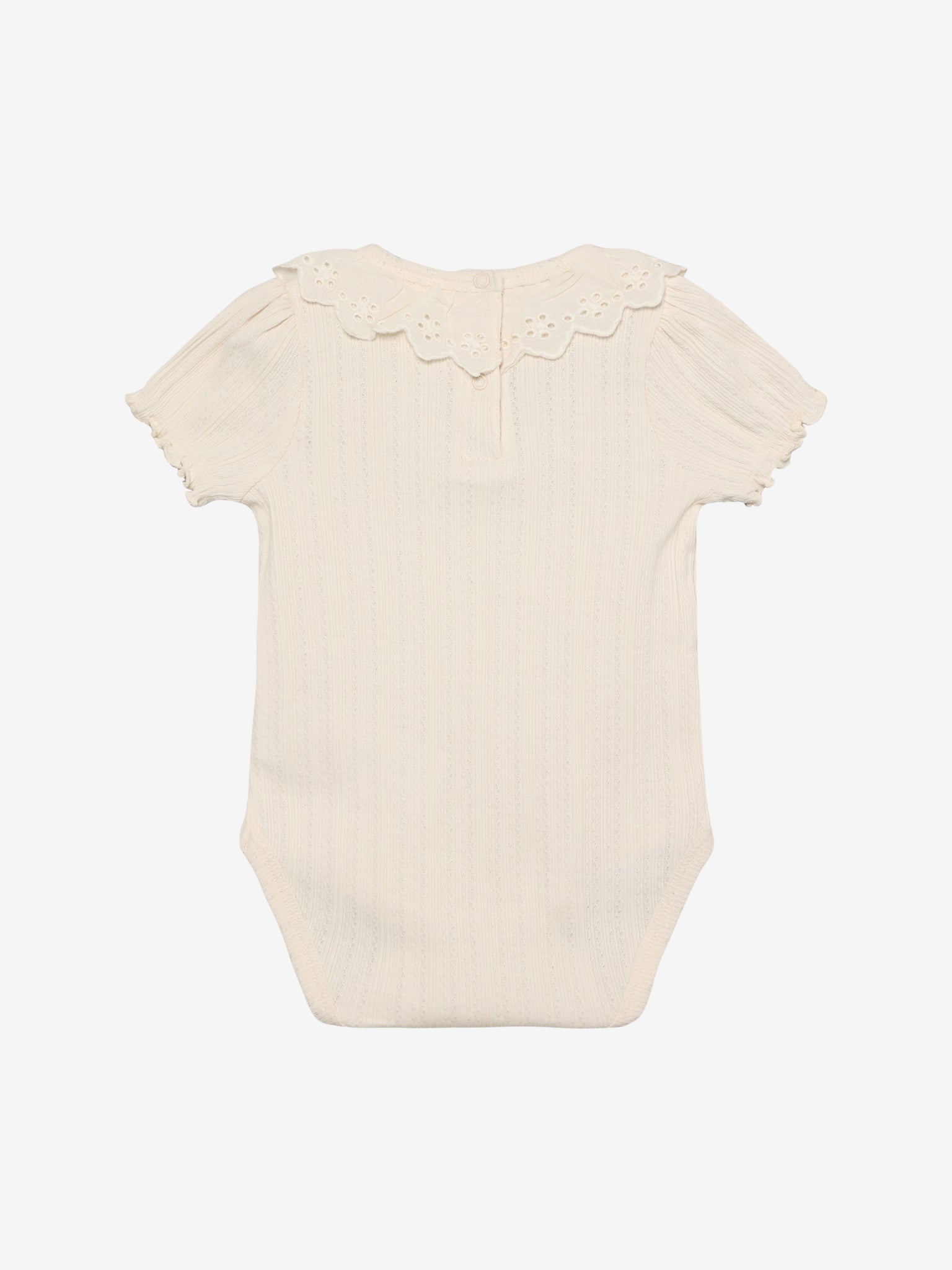 Het fijne pointelle-breipatroon zorgt voor een luchtige structuur, terwijl de geweven kraag met subtiele borduurdetails een charmant en speels accent geeft. Gemaakt van 100% katoen, voelt de body zacht aan op de gevoelige huid van je baby en is ademend voor een comfortabel draagcomfort.